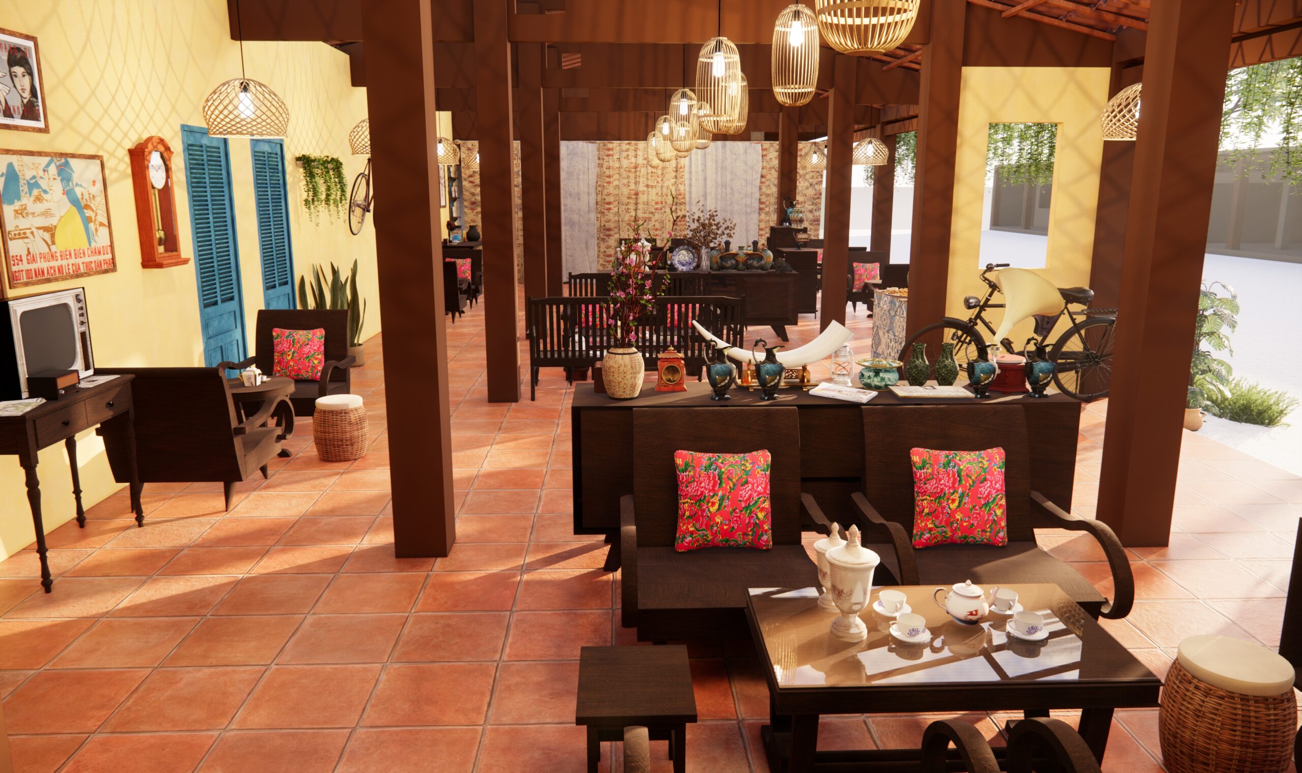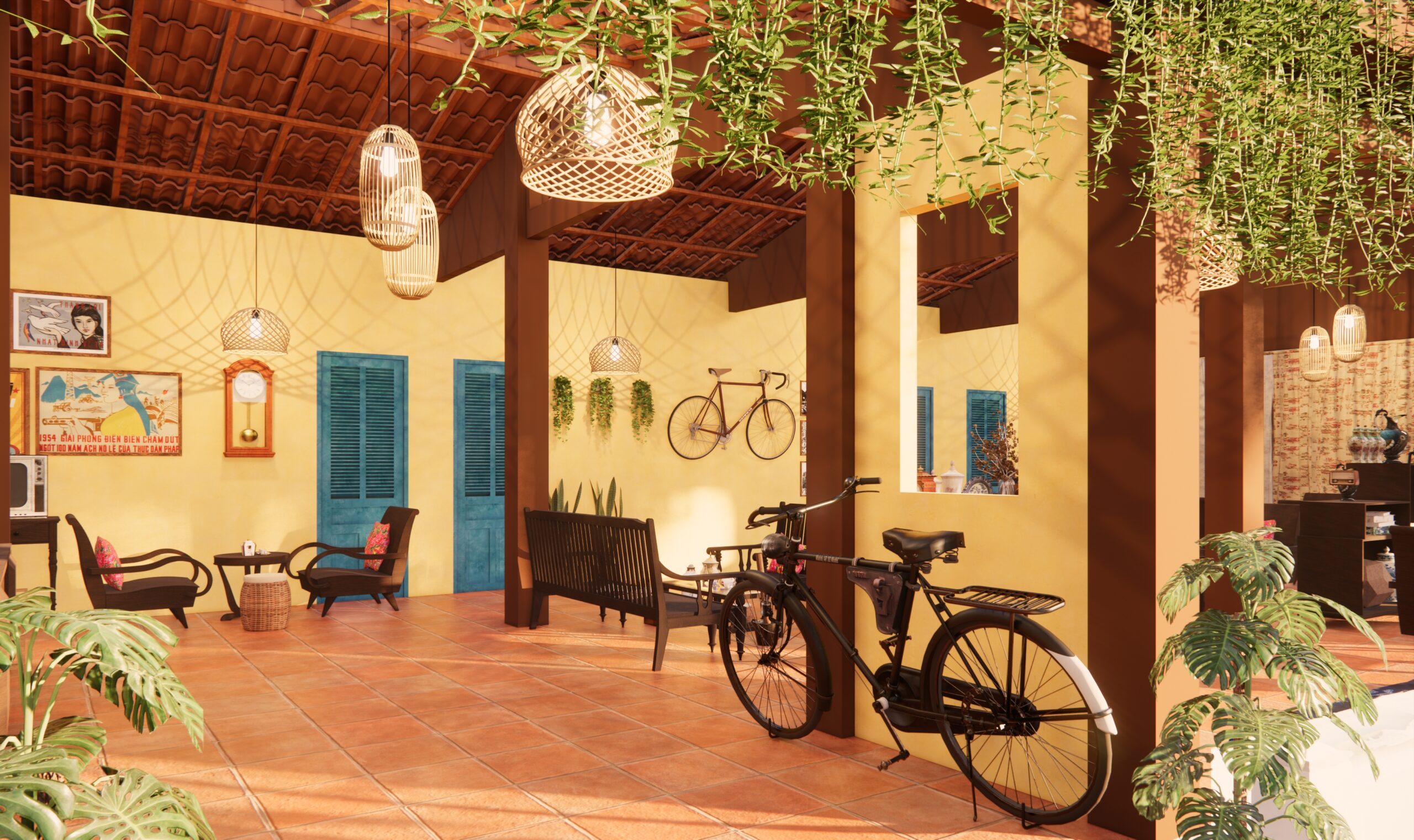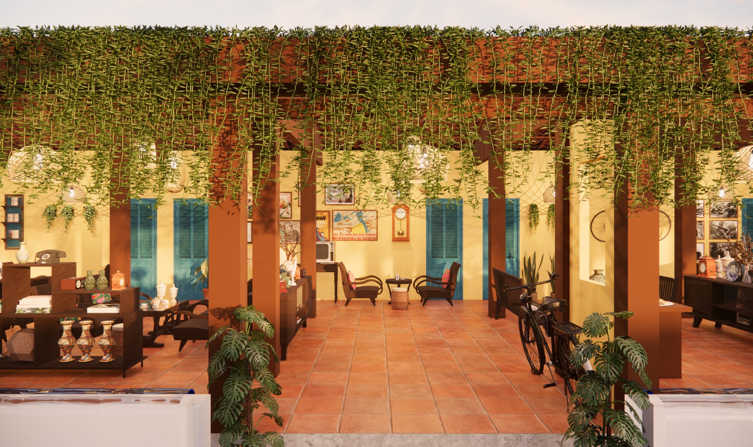 Song song coffee được thiết kế làm 3 khu chính: khu cafe đồ cổ hút thuốc ở bên trái, khu cafe sân vườn ở trung tâm, và khu cafe máy lạnh ở bên phải.