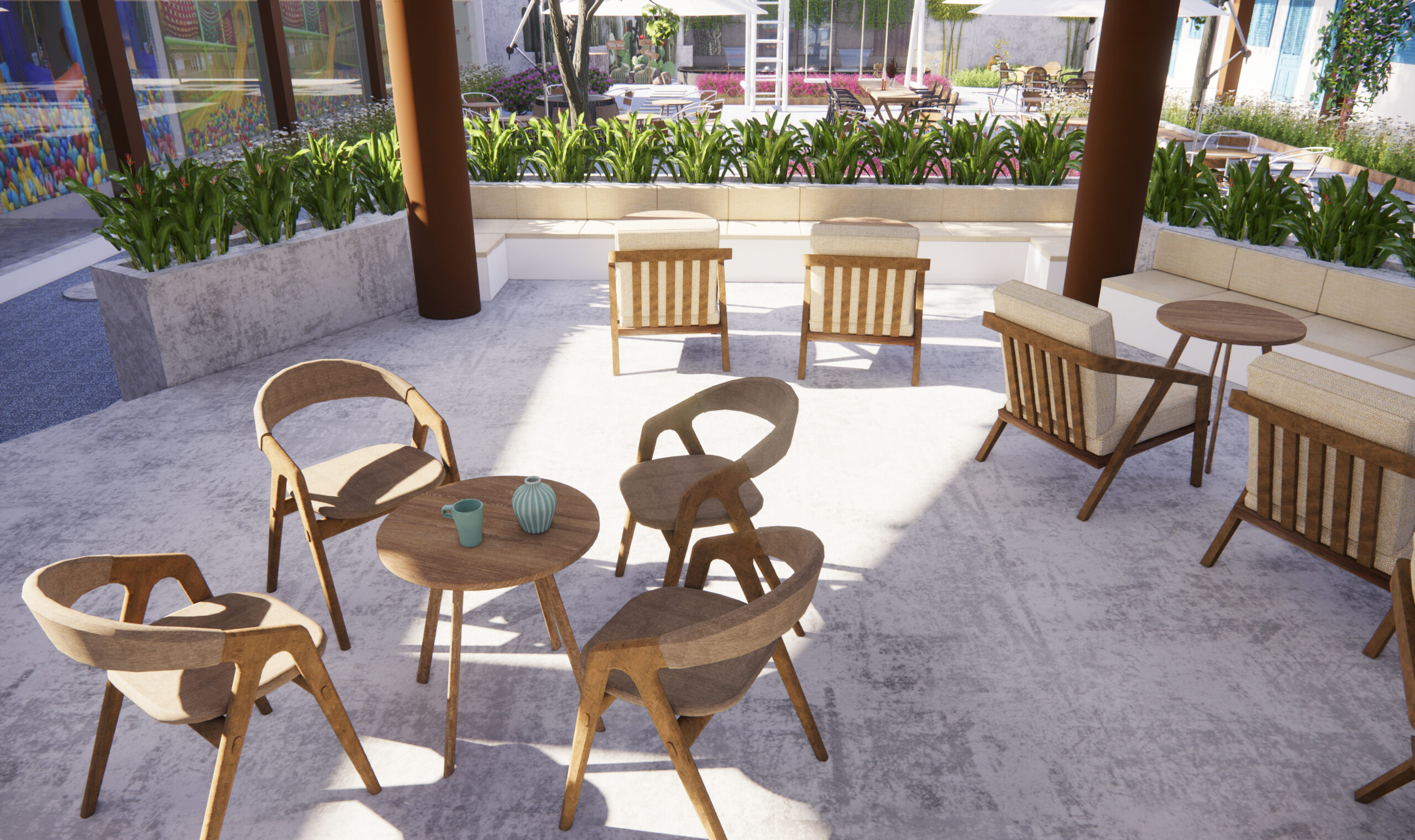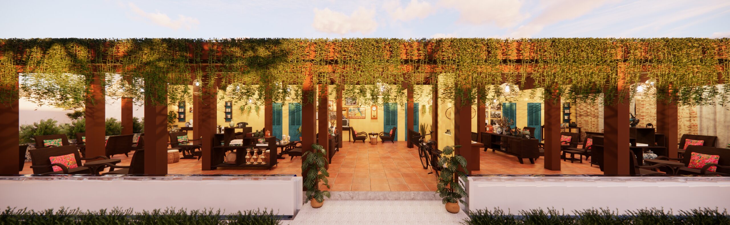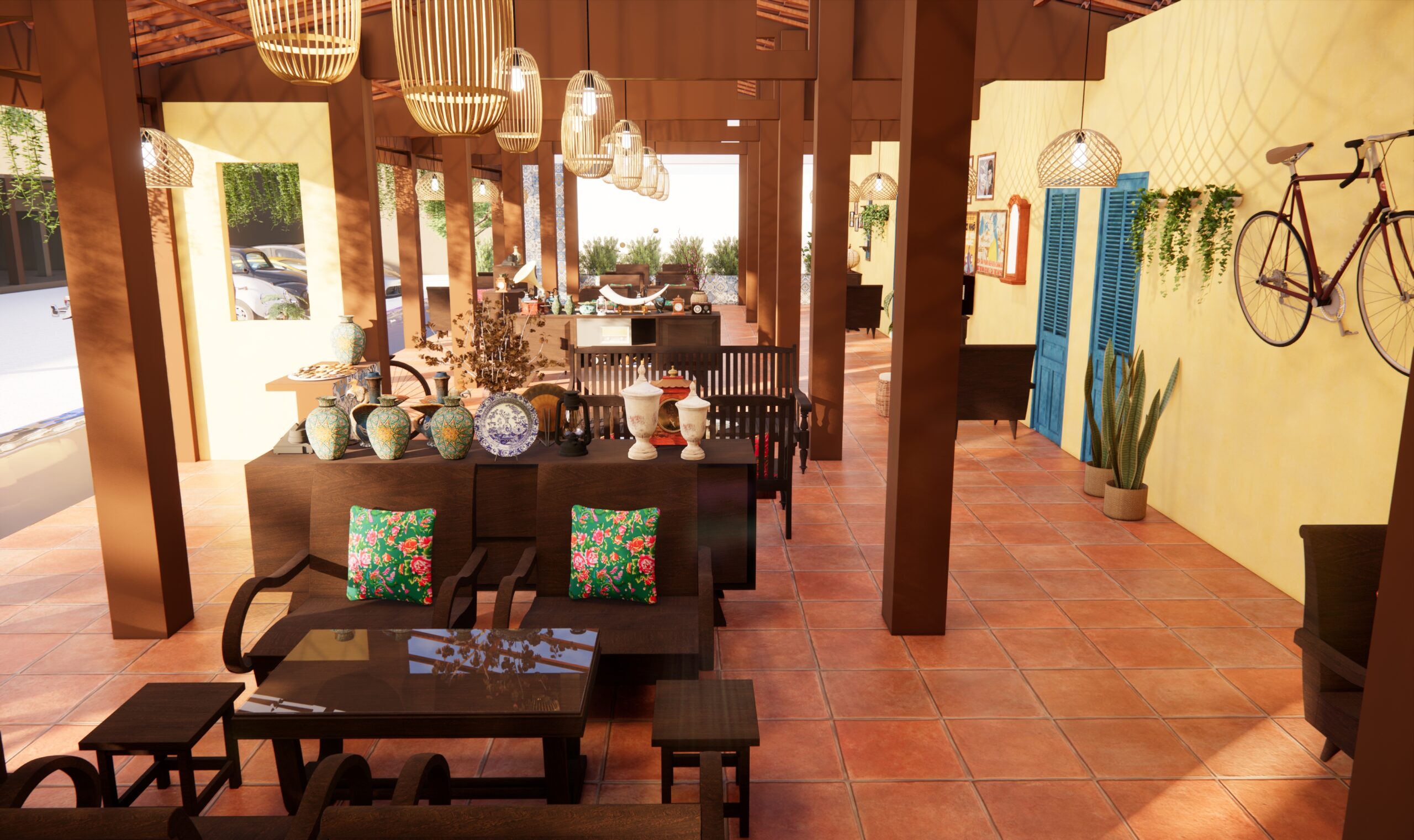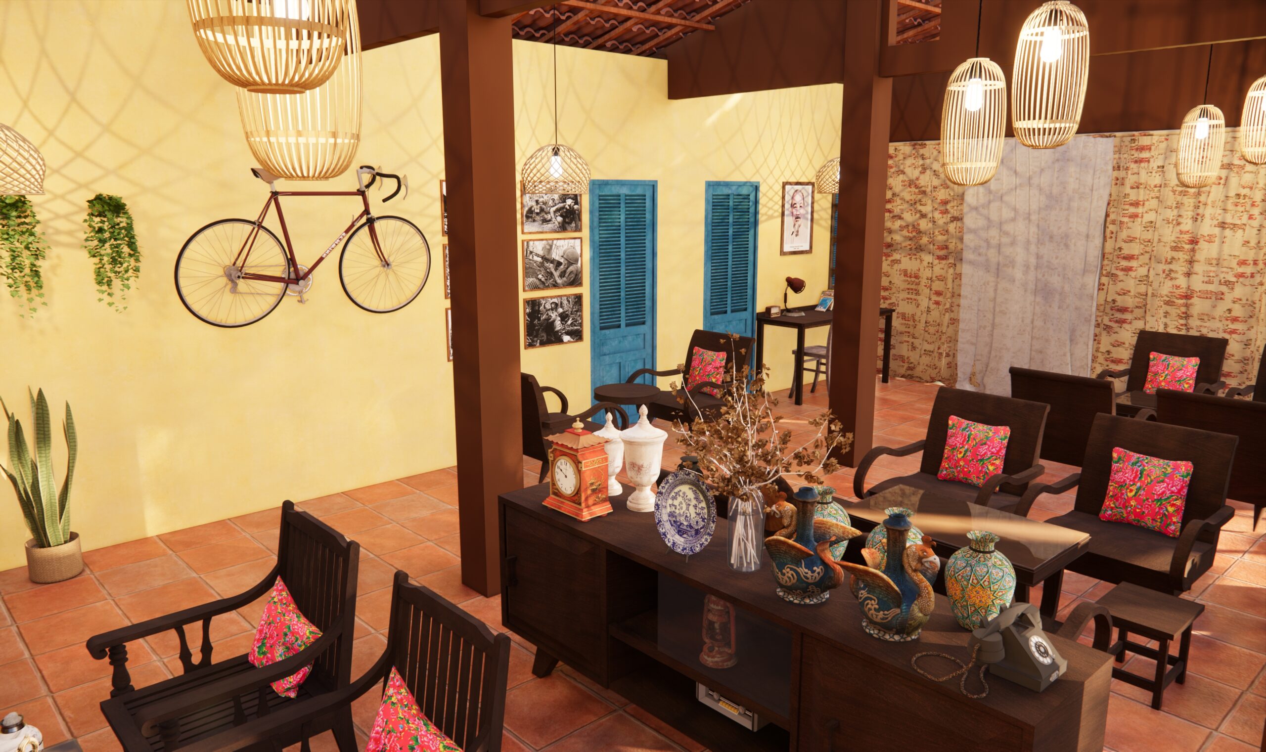 Song song coffee được thiết kế làm 3 khu chính: khu cafe đồ cổ hút thuốc ở bên trái, khu cafe sân vườn ở trung tâm, và khu cafe máy lạnh ở bên phải.